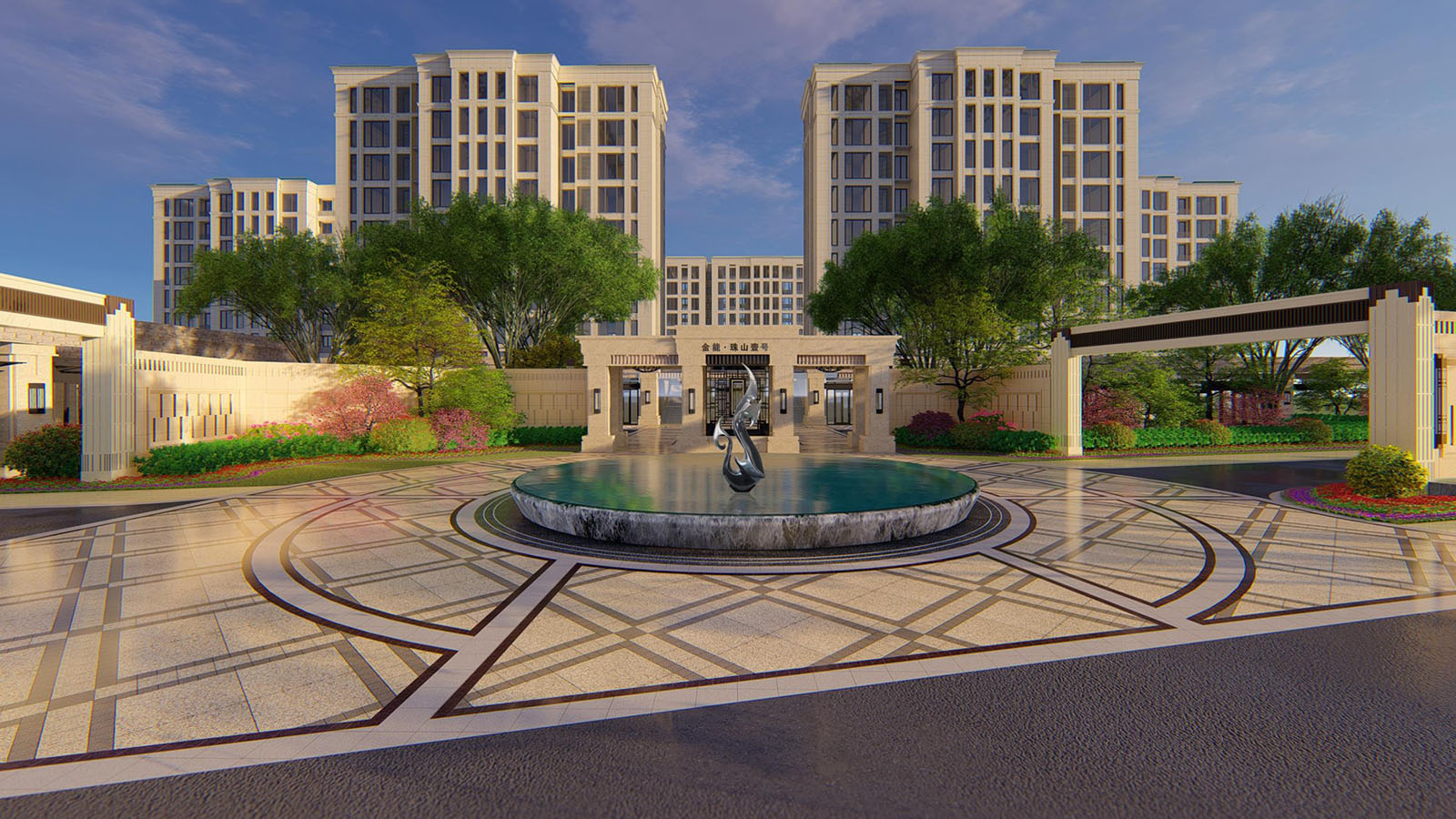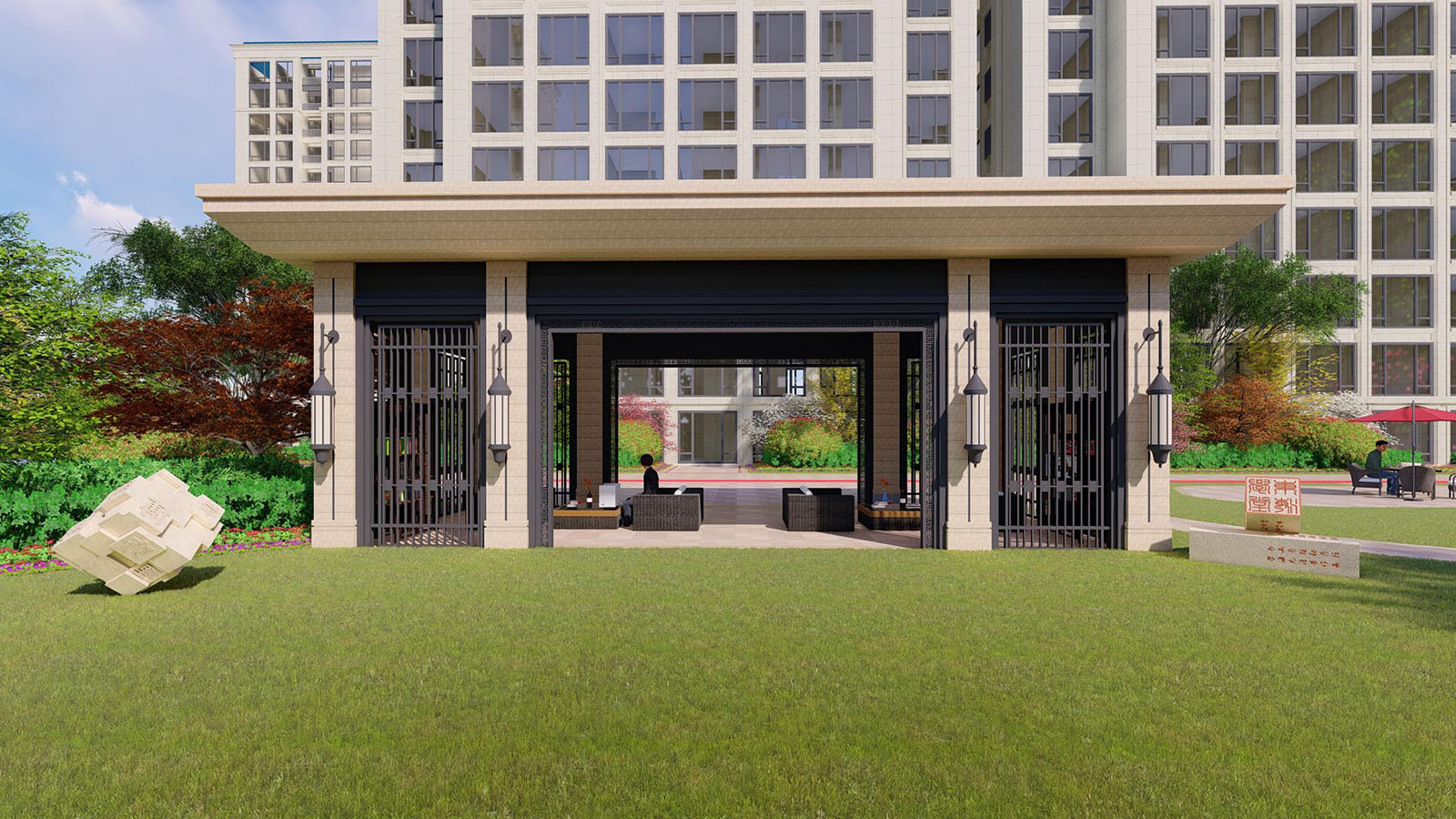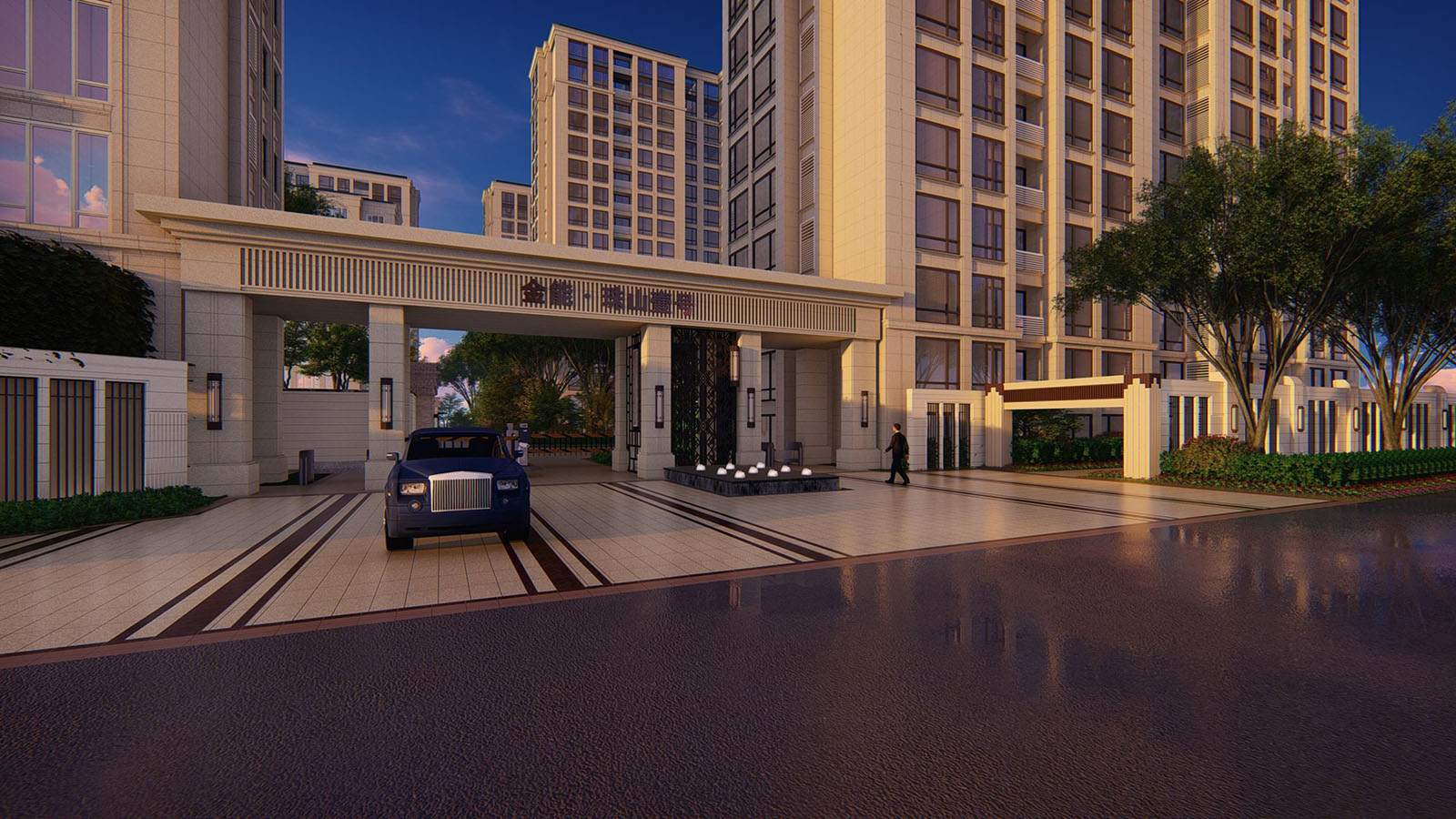 入口廣場的鋪裝線條、立面形象等風格延續(xù)建筑與景觀新古典的時尚與韻味,尊貴與雅致,石庫門與景墻結合設計,形成統(tǒng)一整體、雍容大氣的禮儀迎賓效果。