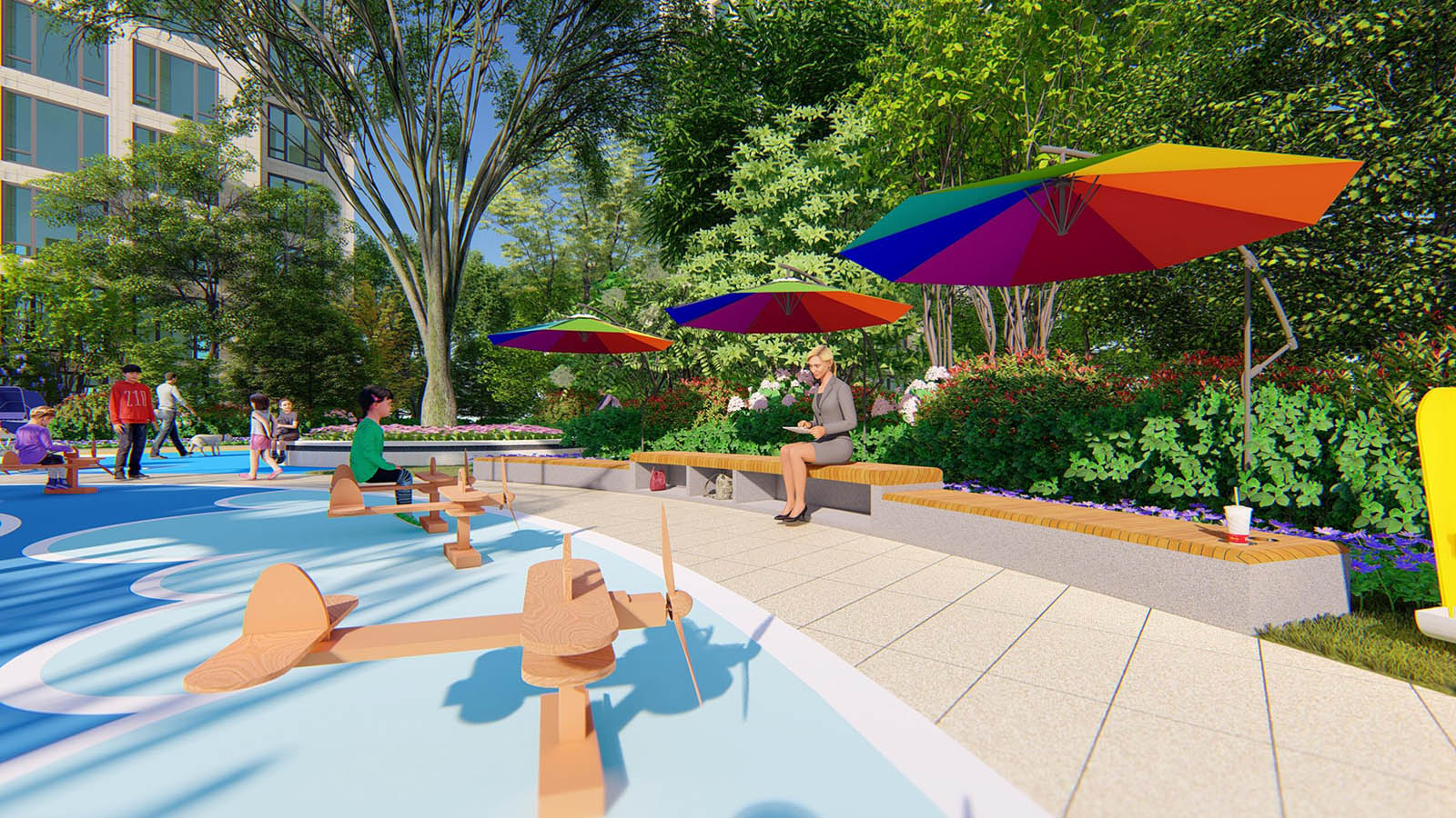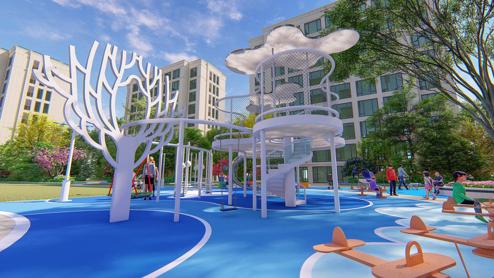 童夢樂園以“云鏡幻夢” 為設計主題,特別設計的云鏡主題滑梯為主景,讓兒童感受云與天空的幻夢鏡光倒影,配置夢幻風車、互動風車、飛行搖搖馬,如夢似幻,以幸福棲居、親子同樂為核心內(nèi)涵,創(chuàng)造家長與兒童互動娛樂活動為主題的親子空間,深入研究兒童的戶外活動方式與形態(tài),創(chuàng)造兒童友好社區(qū),兼顧長輩的看護需求,通過新穎的互動性設計,調(diào)動兒童參與積極性,著力打造一個樂園級別的戶外兒童樂園。
