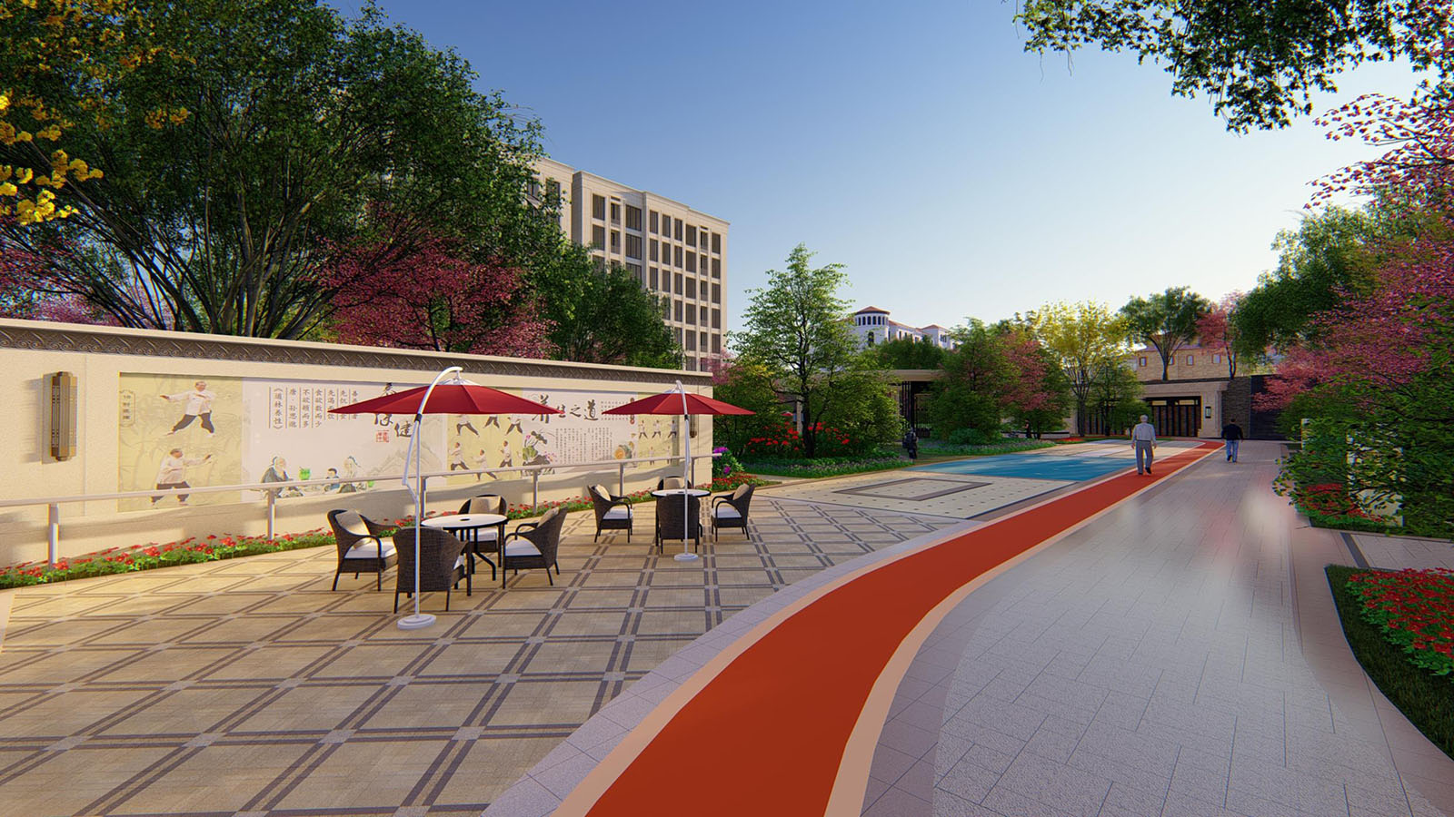 康樂花園包含太極健身區(qū)、棋牌娛樂區(qū)、康樂健身區(qū)、靜養(yǎng)休閑區(qū)、卵石康健步道五大功能,太極健身區(qū)設計太極點位,方便老人展開太極運動,通過對于黃山區(qū)當?shù)厣盍晳T的深度調(diào)研,特別設計了棋牌娛樂空間,方便鄰里間在茶語飯后休閑時間,切磋棋牌游戲,特別強調(diào)林下空間,林蔭步道自然蜿蜒,曲徑通幽,將新古典風格下自然悅居,怡心養(yǎng)性描繪到極致,為老人創(chuàng)造安靜祥和的康樂空間。